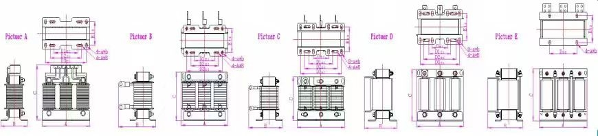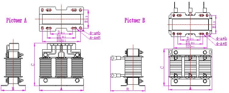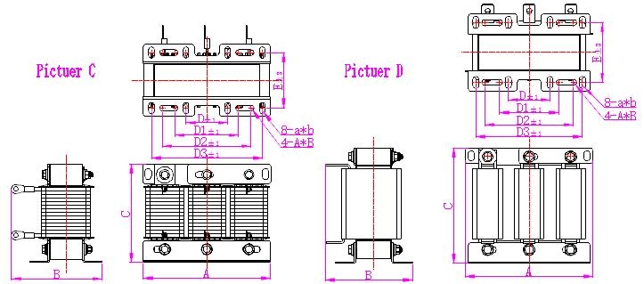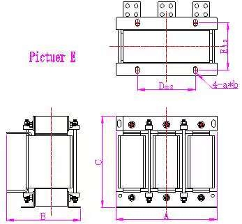 产品型号 | 绕组材质 | 电流 | 电压 | 电压降 | 适配变频器功率 | 图号 | A | B | C | D3 | E |