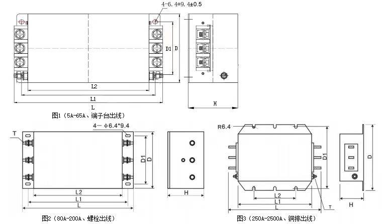 | 产品型号 | 额定电流 | 额定电压 | 适配变频器功率 | 泄漏电流 | 尺寸/Size(unit:mm) | 端子 | |||||